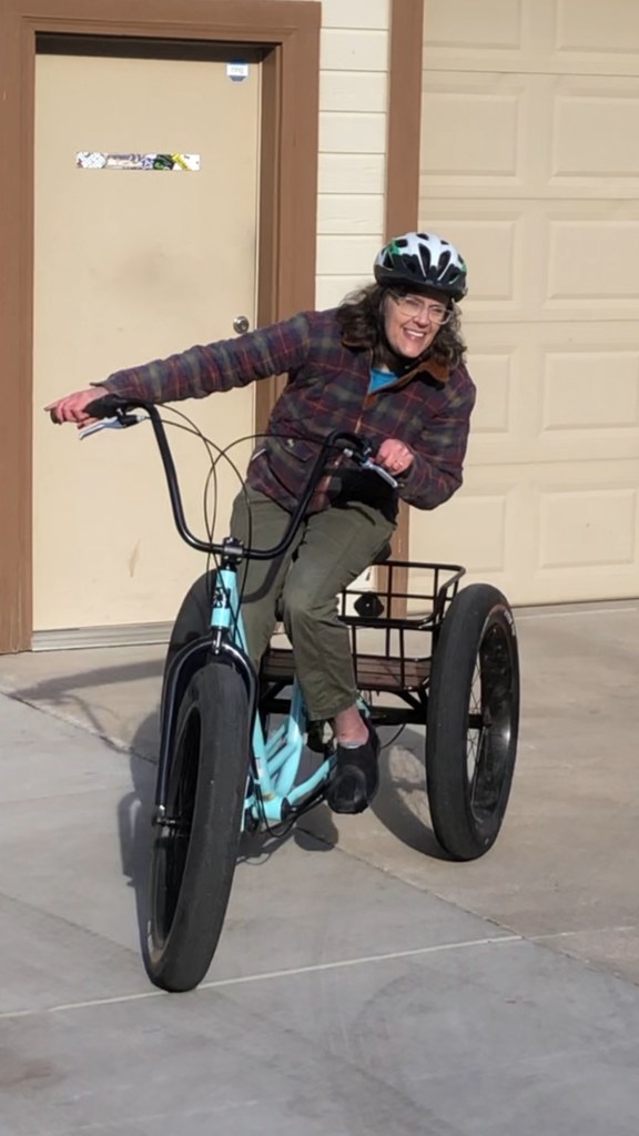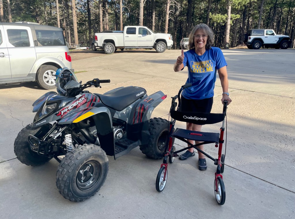 I try to be thankful for all that I can do. It is best for me to be happy with the things I can do, rather than compare what I do now with what I once did. I enjoy riding my tricycle whenever I want, and still get on my mountain bike when Bob is with me. He has to help me get off of my bicycle when I’m done. Hooray for my four wheeler. It offers some freedom! Dirt or snow, I get on it and zoom all over the property. I go riding with the guys when they’re on their motorcycles too. I just love it. Dang it, I think I may have cracked a rib, I rolled the quad and got pinned under it. Stupid me, I really do need to be more careful. There’s no need to go so fast and try to slide. That’s it, I’m going to start acting my age! 🙄